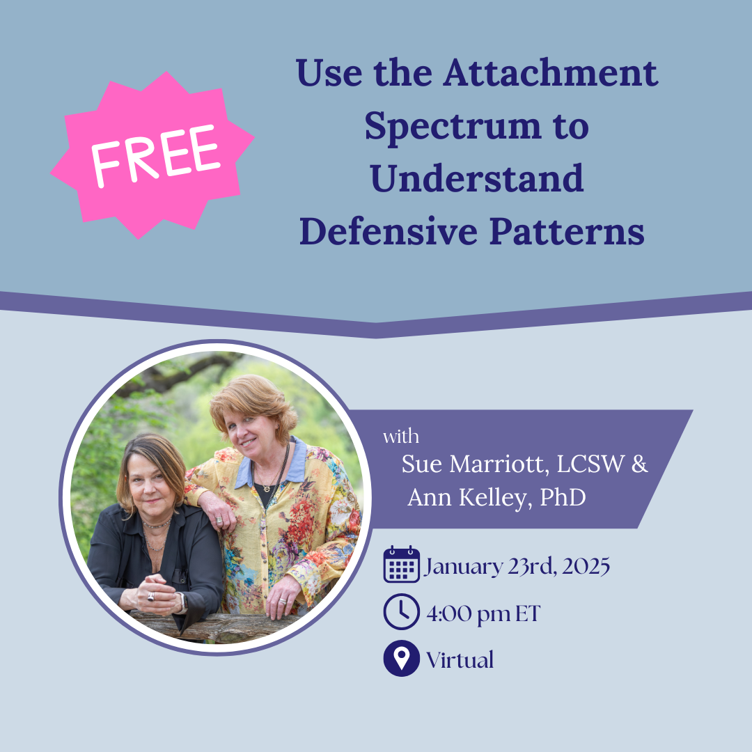 In this one hour webinar, Ann Kelley, PhD and Sue Marriott, LCSW, CGP, hosts of the top ranked Therapist Uncensored Podcast, will deliver a thorough introduction to the Modern Attachment Regulation Spectrum (MARS). This original framework integrates the most important aspects of relational neuroscience and contemporary attachment in an easy to understand and practical to use model. Attendees will examine their patterns of defense and connection, and how these influence relationships and emotional responses.